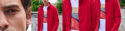 Outer: 93% polyester/7% elastane. Mid layer: waterproof 8000mm breathable 1000g and windproof. Polyester micro fleece inner layer. Collar high YKK zip with inner storm flap. Decorative front and back yokes. Chest and side zip pockets.